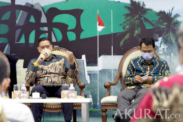 Ketua Bidang Hukum DPP Partai Golkar Adis Kadir (kedua kanan) didampingi Ketua Badan Advokasi Hukum dan HAM (Bakumham) Partai Golkar Supriansa (kiri) dan Ketua DPP Partai Golkar bidang MPO Meutya Hafid (kanan) saat memberikan keterangan pers pascapenahanan Azis Syamsuddin oleh KPK, di