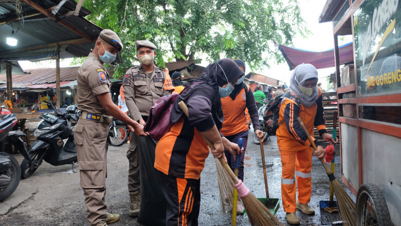 Petugas Kebersihan Dinas Lingkungan Hidup dan Kebersihan (DLHK) Kota Depok membersihkan area Pasar Kemiri Muka, Kecamatan Beji pada saat giat Opsih Terpadu, Rabu (26/01/22). (Foto: JD 01/Diskominfo)