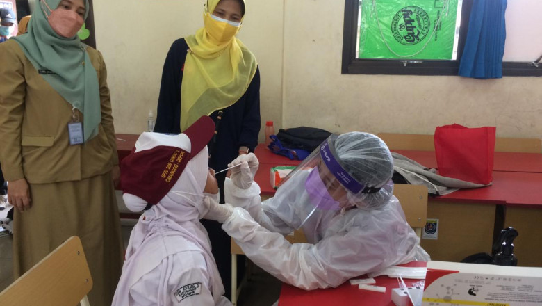 Pelaksanaan tes swab antigen yang dilakukan kepada siswa SDN Curug 2 Kecamatan Cimanggis. (Foto: Istimewa)