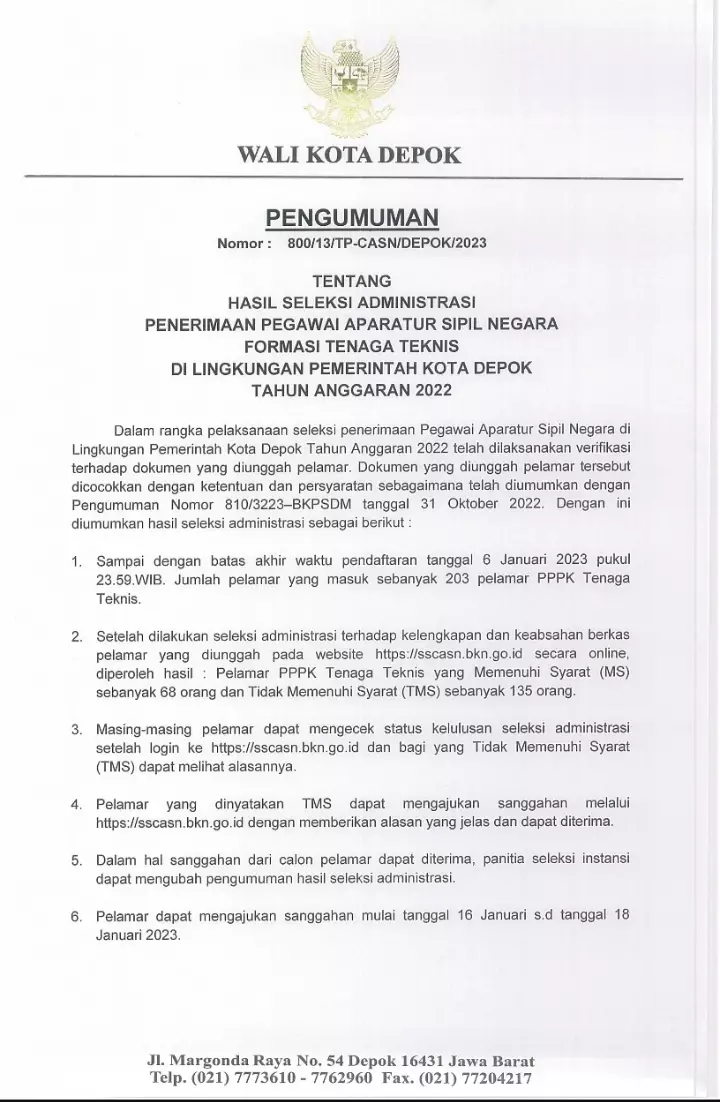 pojokdepok.com- Pemerintah Kota (Pemkot) Depok telah mengumumkan hasil seleksi administrasi penerimaan pegawai aparatur sipil negara formasi tenaga teknis. Hal tersebut disampaikan melalui Surat Pengumuman Nomor: 800/13/TP-CASN/DEPOK/2023 tentang Hasil Seleksi Administrasi Penerimaan Pegawai Aparatur Sipil Negara Formasi Tenaga Teknis di Lingkungan Pemkot Depok Tahun Anggaran 2022.