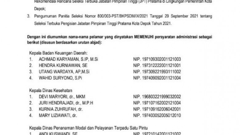 Hasil seleksi administrasi pengisian Jabatan Pimpinan Tinggi Pratama Kota Depok Tahun 2021. (Foto: tangkapan layar).