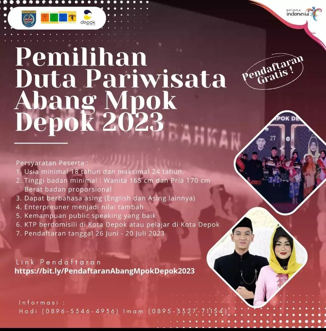 “Yuk ikuti Pemilihan Abang Mpok Depok. Jadilah Duta Pariwisata dan Kebudayaan Kota Depok,” tutupnya. (JD10/ED 02/EUD 04)