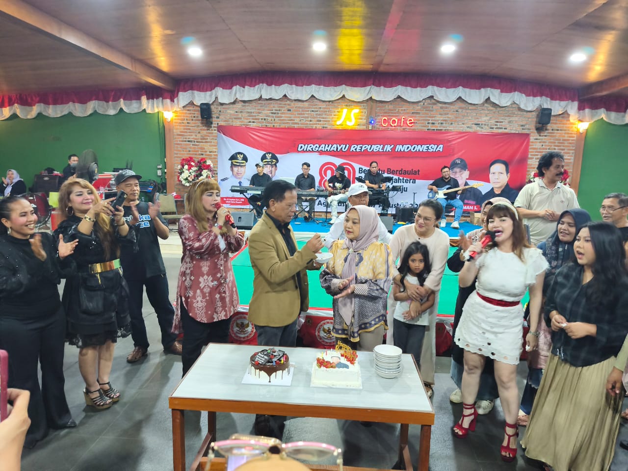 Pojokdepok.com – Puncak acara perayaan HUT ke-80 Kemerdekaan Republik Indonesia di kediaman Haji Sarmili ditutup dengan live musik dan acara ulang tahun sohibul hajat, di Balai Sarmili, Kecamatan Sukmajaya, Depok, Ahad malam, 17 Agustus 2025.