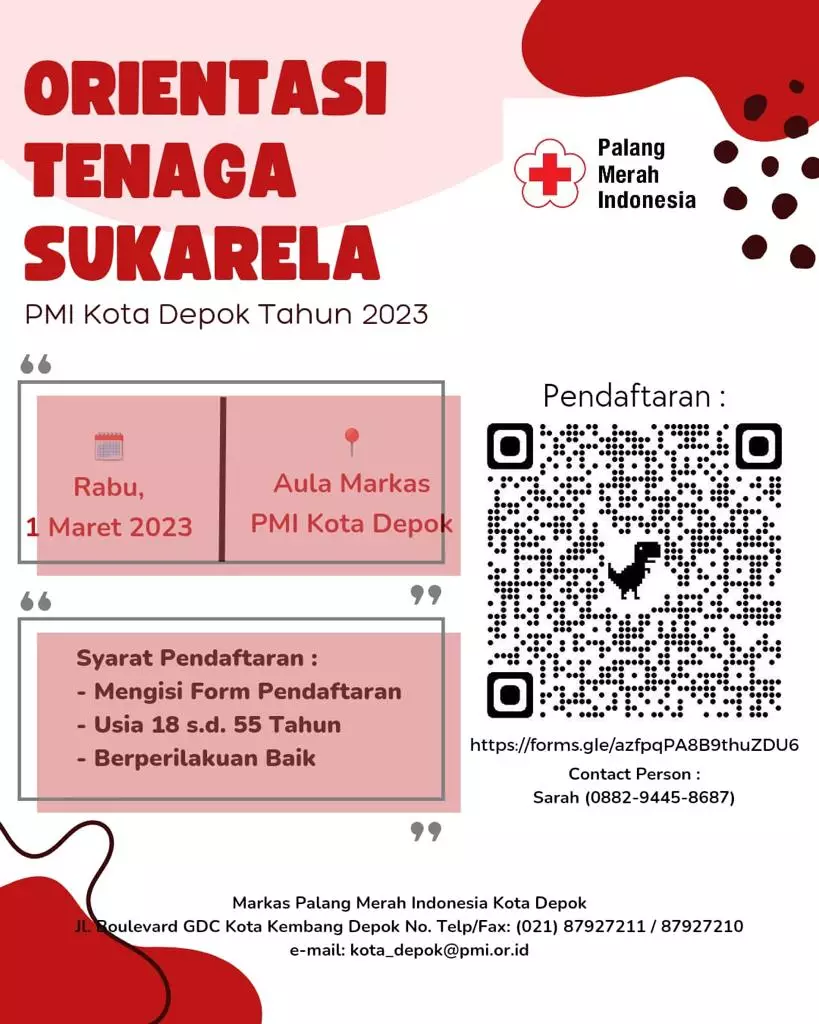 “Rencananya Rabu 1 Maret 2023 kami akan menggelar kegiatan orientasi TSR untuk umum apapun latar belakangnya, di Markas PMI Kota Depok Jalan Boulevard Raya Grand Depok City (GDC). Penambahan calon TSR ini tentunya sesuai dengan kebutuhan di lapangan,” ujar Ketua PMI Kota Depok Dudi Mi’raz, Jumat (10/02/23).