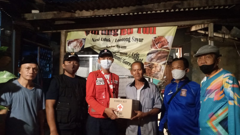 Relawan PMI Kota Depok memberikan bantuan berupa family kit kepada korban puting beliung di Kecamatan Cilodong, Selasa (21/09/21). (Foto: istimewa)
