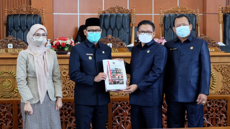 Ketua DPRD Kota Depok, TM. Yusufsyah Putra menyerahkan pokok pikiran DPRD Kota Depok kepada Wali Kota Depok untuk selanjutnya dilakukan pembahasan. (Foto: JD01/Diskominfo)