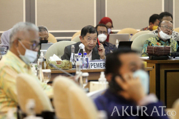 Menteri Perencanaan Pembangunan Nasional (PPN)/Kepala Badan Perencanaan Pembangunan Nasional (Bappenas) Suharso Monoarfa (tengah) mengikuti rapat kerja dengan Panitia Khusus (Pansus) Rancangan Undang-Undang Ibu Kota Negara (RUU IKN) di Kompleks Parlemen MPR/DPR-DPD, Senayan, Jakarta, Senin (17/1/2022). Dalam Rapat Panitia Kerja (Panja) tersebut Menteri PPN/Kepala Bappenas Suharso Monoarfa secara resmi memaparkan nama Ibu Kota Negara (IKN) baru yaitu Nusantara. pojokdepok.com -/Sopian