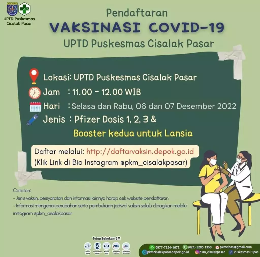 pojokdepok.com – Unit Pelaksana Teknis Dinas (UPTD) Puskesmas Cisalak Pasar (Cipas) membuka pelayanan vaksinasi Covid-19 dosis keempat atau booster kedua untuk kelompok lanjut usia (lansia). Vaksinasi dilaksanakan pada 6-7 Desember 2022.