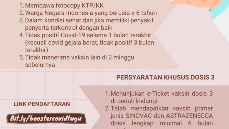 Wara menambahkan, terdapat sejumlah persyaratan bagi penerima vaksin booster. Yaitu, usia mulai 18 tahun ke atas, menunjukkan e-ticket aplikasi PeduliLindungi, dan telah mendapatkan vaksinasi primer dosis lengkap minimal enam bulan sebelumnya.