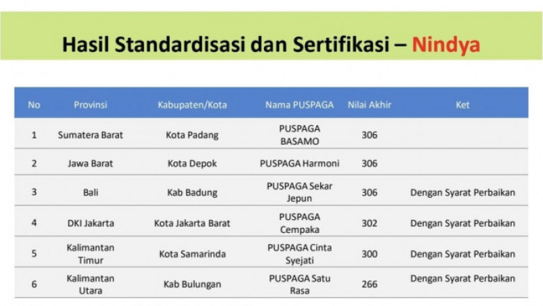 Nessi menjelaskan, untuk meraih predikat Nindya, Puspaga Harmoni telah memenuhi lima poin penilaian. Di antaranya, kelembagaan, sumber daya manusia, program dan layanan atau kegiatan, protokol layanan Puspaga selama pandemi, serta pemantauan, evaluasi dan pelaporan.