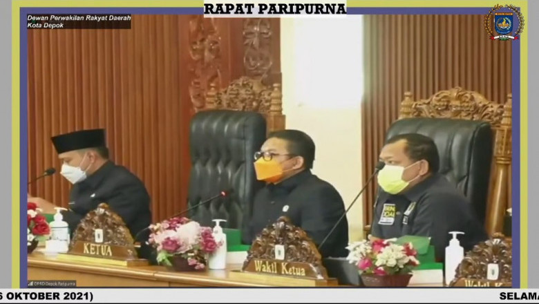 Dewan Perwakilan Rakyat Daerah (DPRD) Kota Depok menggelar Rapat Paripurna dalam rangka Penyampaian Pandangan Umum Fraksi-fraksi terhadap Raperda APBD Tahun Anggaran 2022 secara tatap muka dan virtual di Ruang Rapat Paripurna DPRD Kota Depok, Rabu (06/10/21). Rapat Paripurna dihadiri oleh Wakil Wali Kota Depok Imam Budi Hartono. (JD01/EUD02)