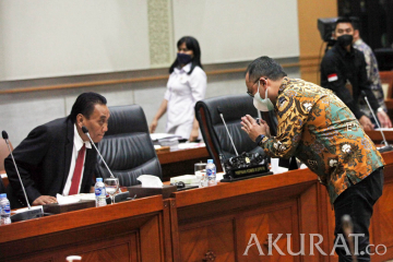 Anggota DPR Fraksi PDIP Arteria Dahlan menyapa Kepala Pusat Pelaporan dan Analisis Transaksi Keuangan (PPATK) Ivan Yustiavandana saat akan menggelar rapat dengar pendapat (RDP) di Nusantara II, Kompleks Parlemen MPR/DPR-DPD, Senayan, Jakarta, Senin (31/1/2022). Rapat ini membahas mengenai pencegahan dan penindakan tindak pidana pencucian uang dan skema rencana kerja isu-isu strategis PPATK. pojokdepok.com -/Sopian