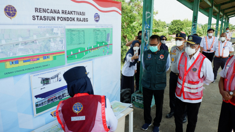 Wakil Wali Kota Depok, Imam Budi Hartono mendampingi Menteri Perhubungan Republik Indonesia, Budi Karya Sumadi saat meninjau rencana reaktivasi Stasiun Kereta Pondok Rajeg yang terletak di wilayah Kelurahan Jatimulya, Cilodong, Rabu (11/08/21). (Foto: JD 01/Diskominfo)