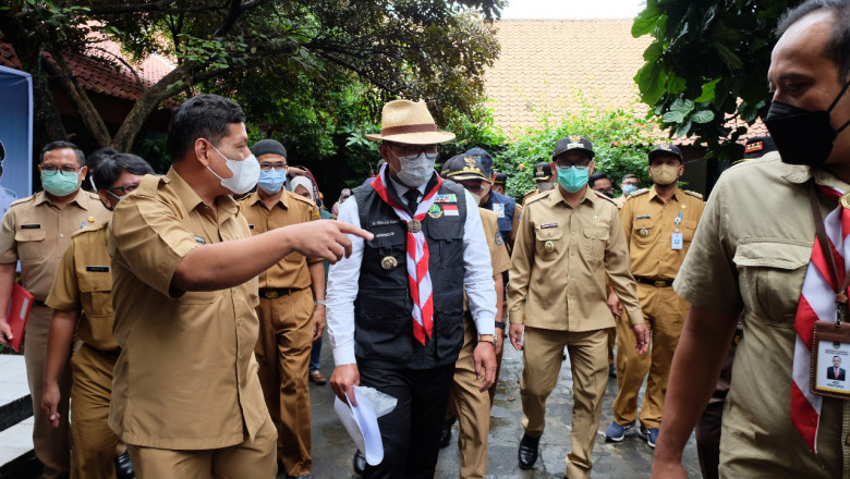 Gubernur Jawa Barat, Ridwan Kamil didampingi Wali Kota Depok Mohammad Idris dan Wakil Wali Kota Depok Imam Budi Hartono saat meninjau lokasi rencana pembangunan Masjid Raya di SDN 1 Pondok Cina, Kecamatan Beji, Senin (14/02/22).