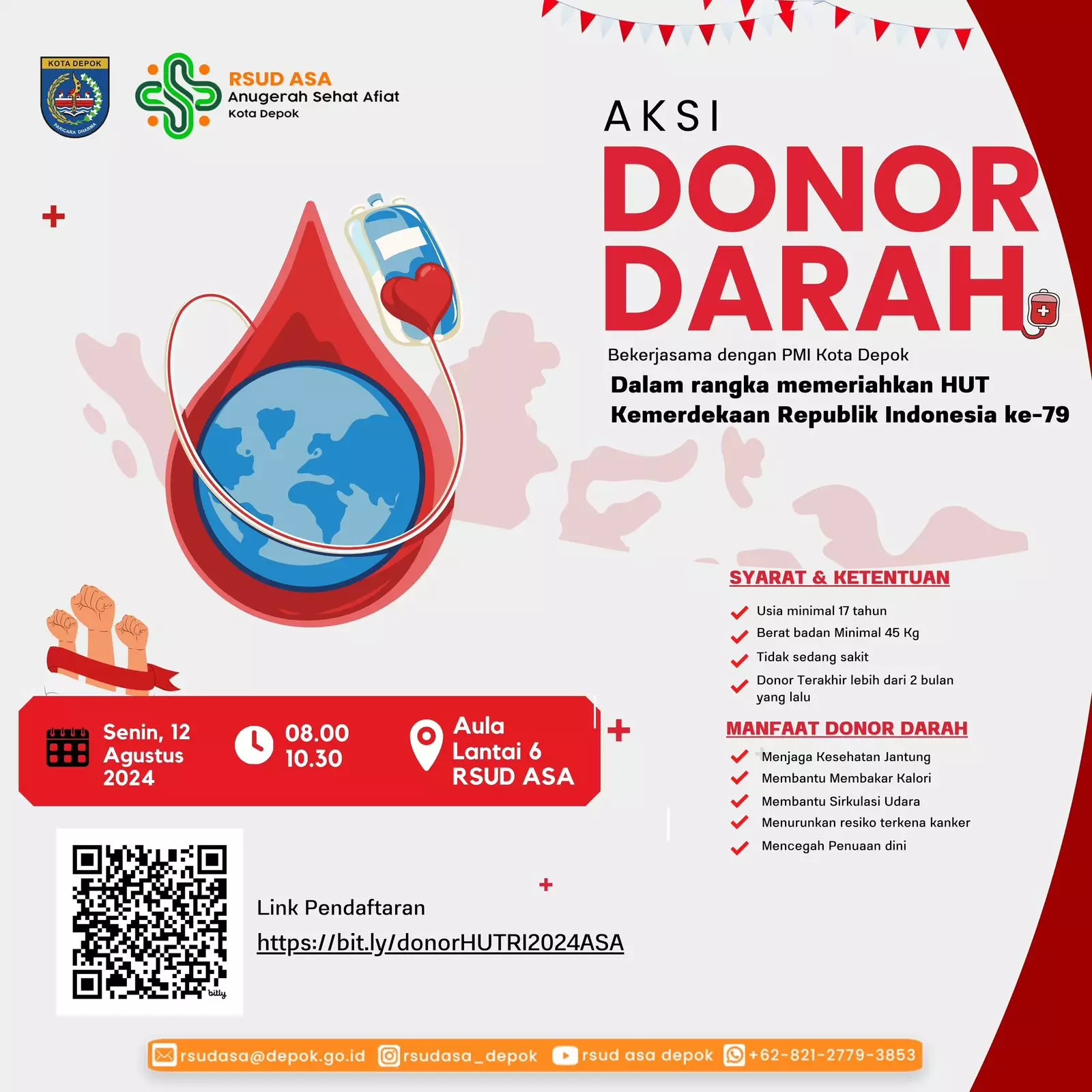 pojokdepok.com – Guna memeriahkan Hari Ulang Tahun (HUT) ke-79 Kemerdekaan Republik Indonesia (RI), Rumah Sakit Umum Daerah (RSUD) Anugerah Sehat Afiat (ASA) bekerja sama dengan PMI Kota Depok akan menggelar kegiatan donor darah.