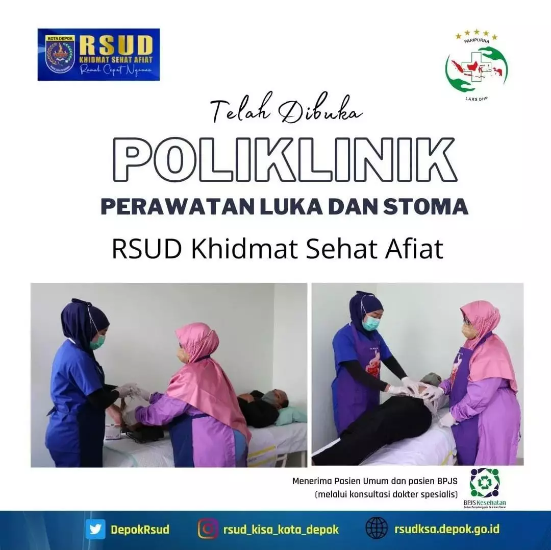 pojokdepok.com – Rumah Sakit Umum Daerah (RSUD) Khidmat Sehat Afiat (KiSA) Kota Depok kini membuka Poliklinik Perawatan Luka dan Stoma, per 1 Februari 2023. Beragam jenis luka dan stoma bisa ditangani dengan perawatan teknik modern.