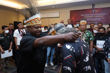 Setelah seluruh DPW Sahabat Ganjar melaksanakan tanda tangan aklamasi, Ketua DPW Sahabat Ganjar Papua Isak Giay memberikan cendra mata berupa ikat kepala khas Papua kepada, Dewan Pembina Sahabat Ganjar Gus Khayat, Ketua Umum Sahabat Ganjar Gus Nahib dan Ketua Pelaksana Rakernas Indah.