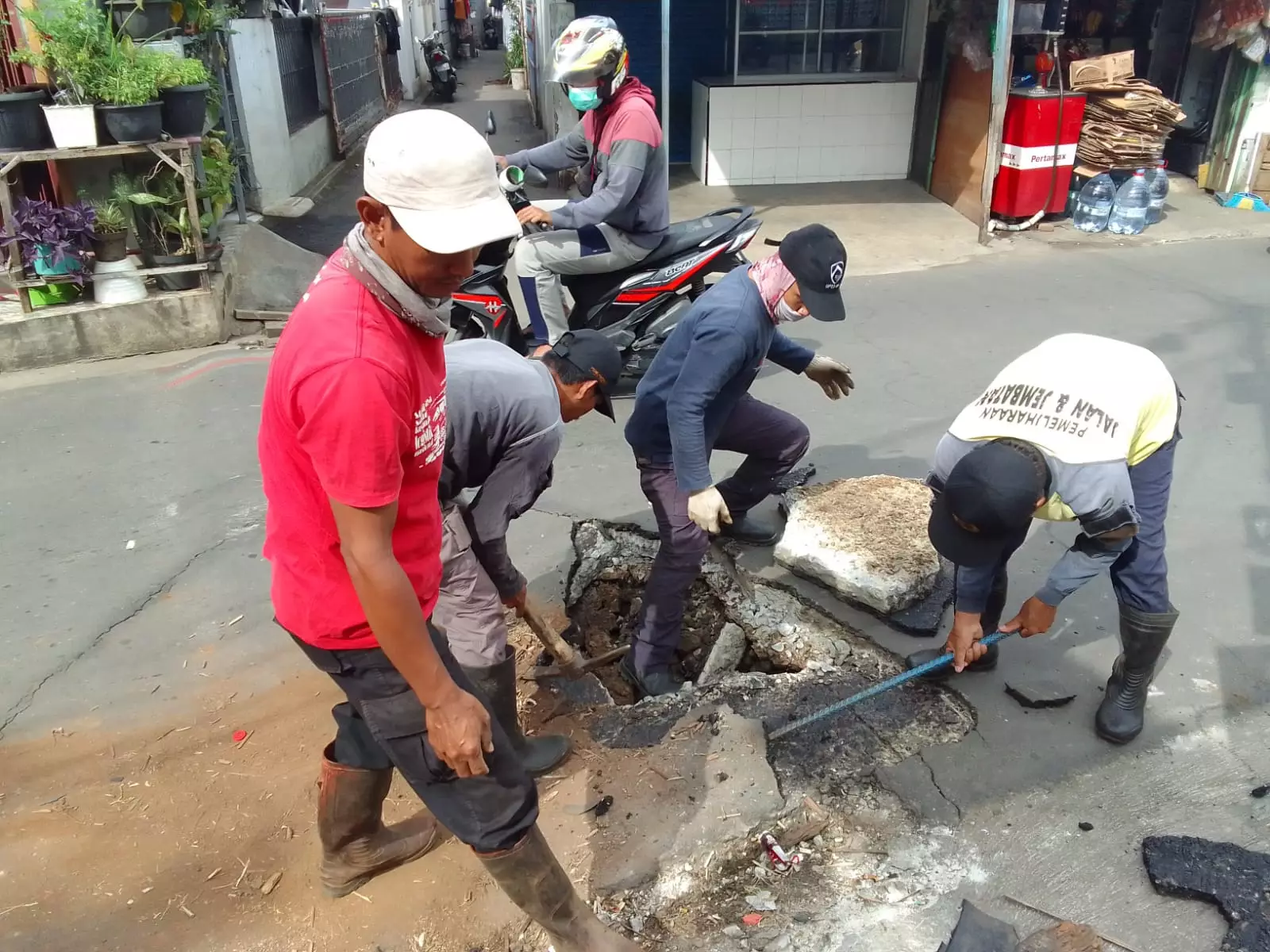 pojokdepok.com – Sebanyak satu regu Satgas Dinas Pekerjaan Umum dan Penataan Ruang (DPUPR) Kota Depok diturunkan untuk melakukan perbaikan saluran di Jalan Muslih Kelurahan/Kecamatan Beji. Perbaikan dilakukan karena box culvert amblas.