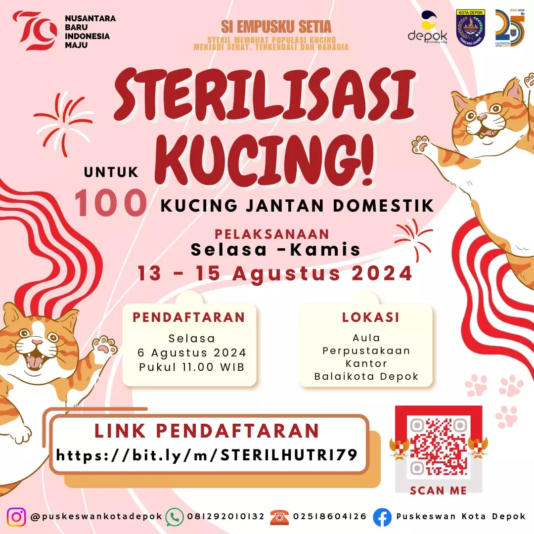 Pendaftaran program sterilisasi gratis ini akan dibuka pada hari Selasa, 6 Agustus 2024, mulai pukul 11.00 WIB melalui tautan pendaftaran yang tersedia di https://bit.ly/m/STERILHUTRI79.
