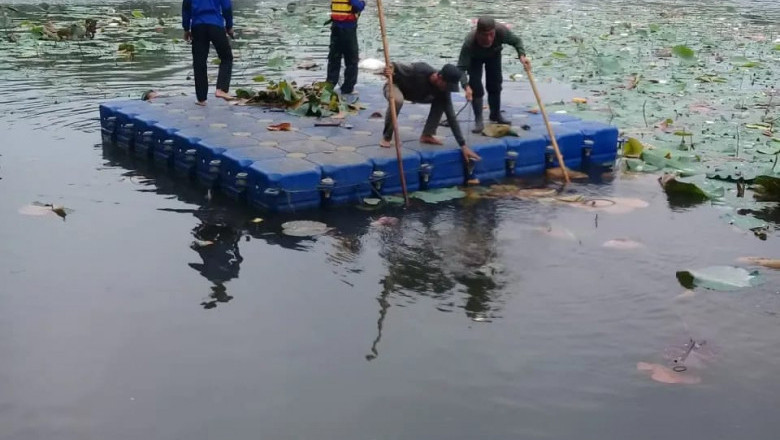 Satgas DPUPR Kota Depok menggiring sampah menggunakan kubus apung HDPE di Situ Cilodong, Senin (17/01/22). (Foto: istimewa)