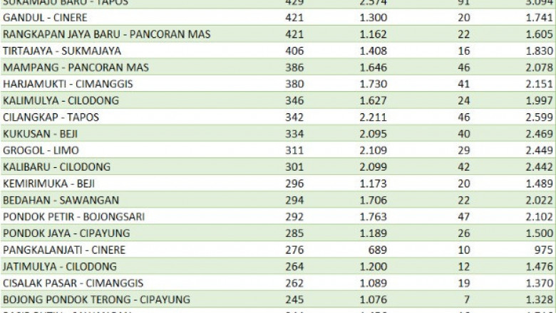 Yaitu Kelurahan Leuwinanggung 92 kasus, Bojongsari 104 kasus, Cipayung Jaya 111 kasus, Sawangan Baru 118 kasus. Lalu, Bojongsari Baru 119 kasus, Cimpaeun 122 kasus, Duren Mekar 127 kasus, Tapos 131 kasus, dan Beji Timur 132 kasus.