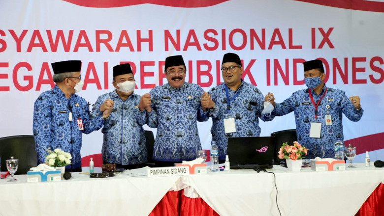 Sekretaris Daerah Kota Depok, Supian Suri (paling kanan) menjadi anggota pimpinan sidang bersama perwakilan provinsi, pengurus nasional dan kementerian/lembaga saat Munas IX Korpri, di BPSDM Kementerian Dalam Negeri, Jakarta Selatan, Sabtu (29/01/22). (Foto: istimewa).