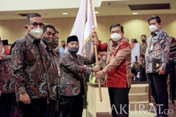 Ketua Umum Asosiasi DPRD Kabupaten Seluruh Indonesia (ADKASI) Lukman Said menerima bendera dari Pelaksana Tugas (Plt.) Sekretaris Jenderal (Sekjen) Kementerian Dalam Negeri (Kemendagri) Suhajar Diantoro saat pelantikan pengurus di Gedung Nusantara V, Kompleks Parlemen MPR/DPR-DPD, Senayan, Jakarta (14/3/2022). Pelantikan DPN ADKASI periode 2021-2026 ini dilakukan setelah pelaksanaan Munas yang berlangsung di Jakarta dengan dihadiri delegasi seluruh pimpinan DPRD Kabupaten di Indonesia dan secara aklamasi memilih Lukman Said, legislator asal Kabupaten Pasangkayu. pojokdepok.com -/Sopian