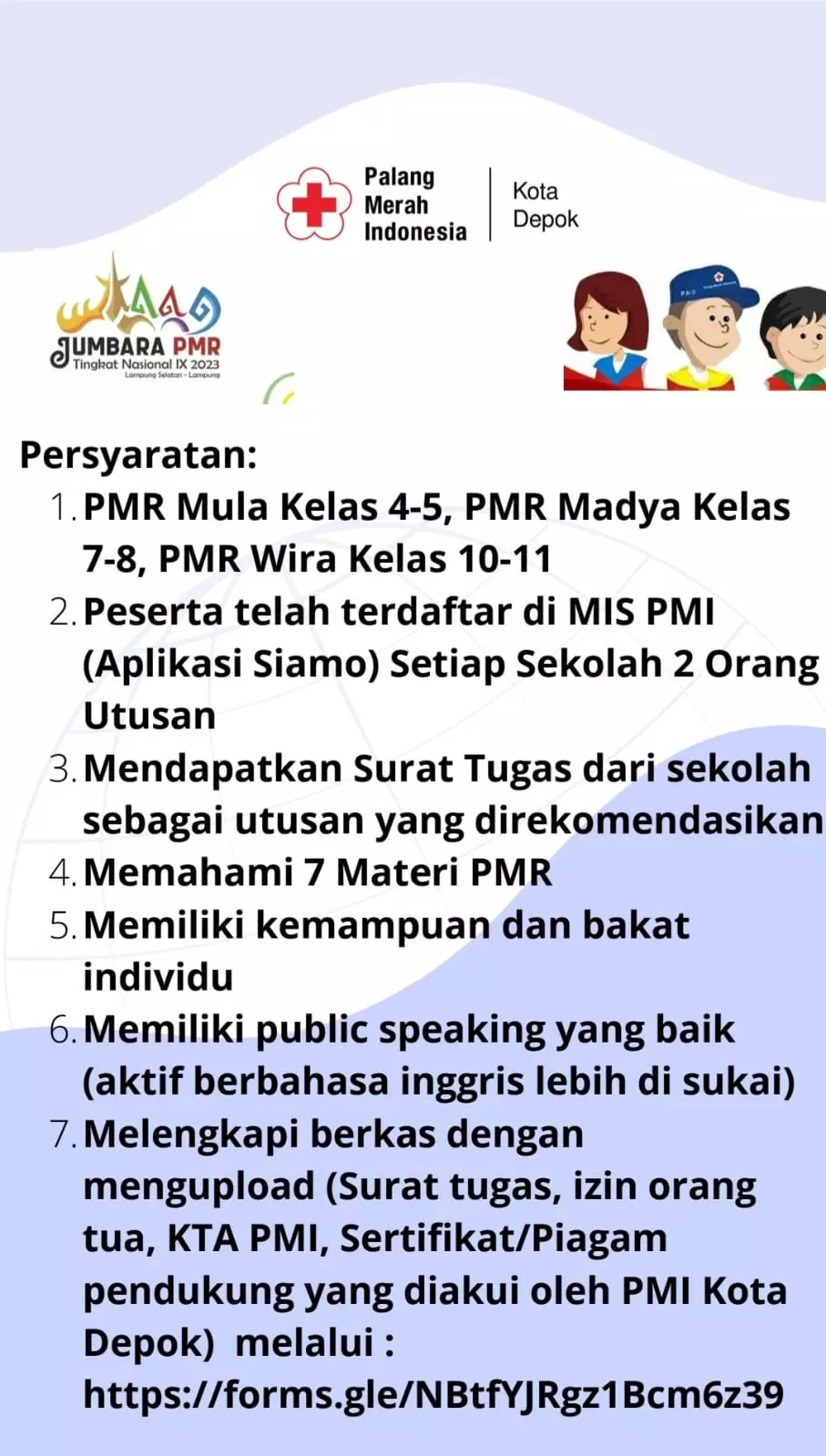 “Ketentuan dan syarat sudah kami buat. Seperti, seleksi ini diperuntukan bagi Palang Merah Remaja (PMR) Mula Kelas IV-V, PMR Madya Kelas VII-VIII dan PMR Wira Kelas X-XI. Baik swasta maupun negeri,” ujar Kepala Markas PMI Kota Depok, Imron Maulana, Rabu (05/04/23).