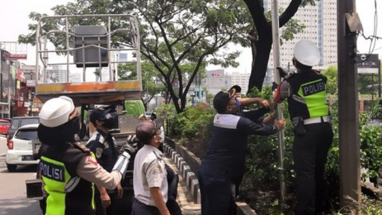 Pemasangan Rambu lalin di jalan Margonda Raya oleh Polres Metro Depok dan Dishub Depok. (Istimewa)