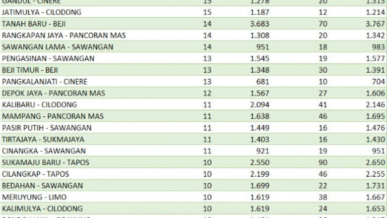 Pancoran Mas dan Kemiri Muka terdapat 20 kasus. Kemudian, Kelurahan Sukamaju dan Harjamukti, mencatatkan 21 kasus dan Jatijajar mencatatkan 22 kasus konfirmasi aktif Covid-19.
