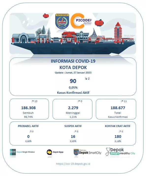 pojokdepok.com- Pemerintah Kota (Pemkot) Depok kembali memperbarui data perkembangan kasus Covid-19. Berdasarkan data yang dirilis per tanggal 27 Januari 2023, kasus pasien sembuh terus mengalami penambahan.
