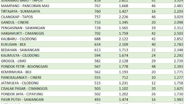 Kemudian Abadijaya 1.338 kasus, Mekarsari 1.378 kasus, Sukamajau 1.455 kasus, Sukatani 1.599 kasus, Bakti Jaya 1.717 kasus, Mekar Jaya 1.841 kasus, serta Tugu 2.363 kasus.