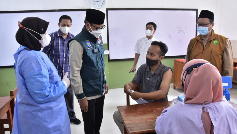 Wakil Wali Kota Depok Imam Budi Hartono melalukan peninjauan pelaksanaan vaksinasi di di SMK Bina Mulia, di Jalan Puskesmas RW. 04, Kelurahan Pasir Putih Kecamatan Sawangan pada Minggu (24/10/21). (Foto : Istimewa)