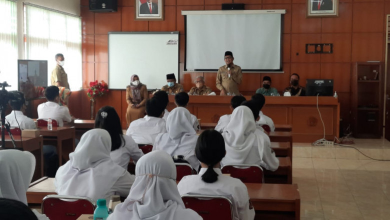 Wakil Wali Kota Depok, Imam Budi Hartono saat menghadiri kegiatan Pendidikan Politik Bagi Pemilih Pemula di SMAN 1 Depok, Senin (28/03/22). (Foto: Diskominfo)
