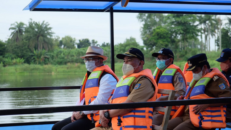 pojokdepok.com – Wali Kota Depok Mohammad Idris bersama Wakil Wali Kota Depok Imam Budi Hartono mengajak Gubernur Jawa Barat Ridwan Kamil meninjau lokasi rencana pembangunan Alun-alun Wilayah Barat di Situ Tujuh Muara, Bojongsari, Senin (14/02/22). (JD01/ED02/EUD02)