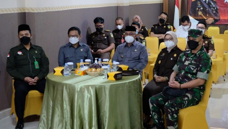 Wali Kita Depok Mohammad Idris (tengah) menghadiri Launching Kampung Restorative oleh Jaksa Agung RI secara virtual di Aula Kejaksaan Negeri Depok, Rabu (16/03/22).
