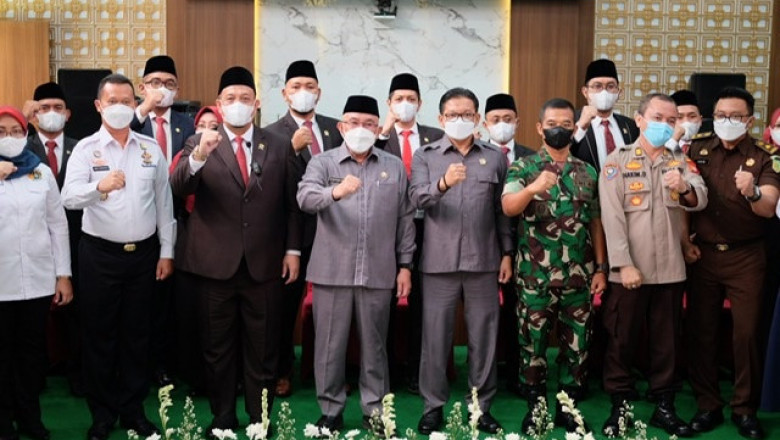 Wali Kota Depok Mohammad Idris (keempat kiri) usai sambutan pada kegiatan Laporan Tahunan Pengadilan Negeri (PN) Depok di Ruang Sidang Utama PN Depok, Rabu (16/03/22).