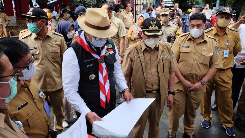 pojokdepok.com – Wali Kota Depok Mohammad Idris bersama Wakil Wali Kota Depok Imam Budi Hartono mendampingi Gubernur Jawa Barat Ridwan Kamil meninjau lokasi rencana pembangunan Masjid Raya Margonda di Kelurahan Pondok Cina, Beji, Senin (14/02/22). (JD01/ED02/EUD02)
