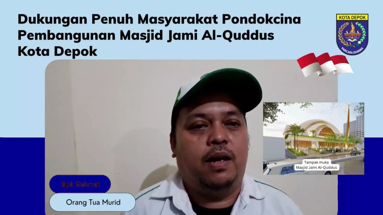 Hal senada juga disampaikan, Rahmat, perwakilan orang tua murid SDN Pondok Cina 1. Dia jmenyampaikan dukungamnya terhadap pembangunan Masjid Jami Al Quddus dan juga mendorong pembangunan SMP Negeri di wilayah Pondok Cina.