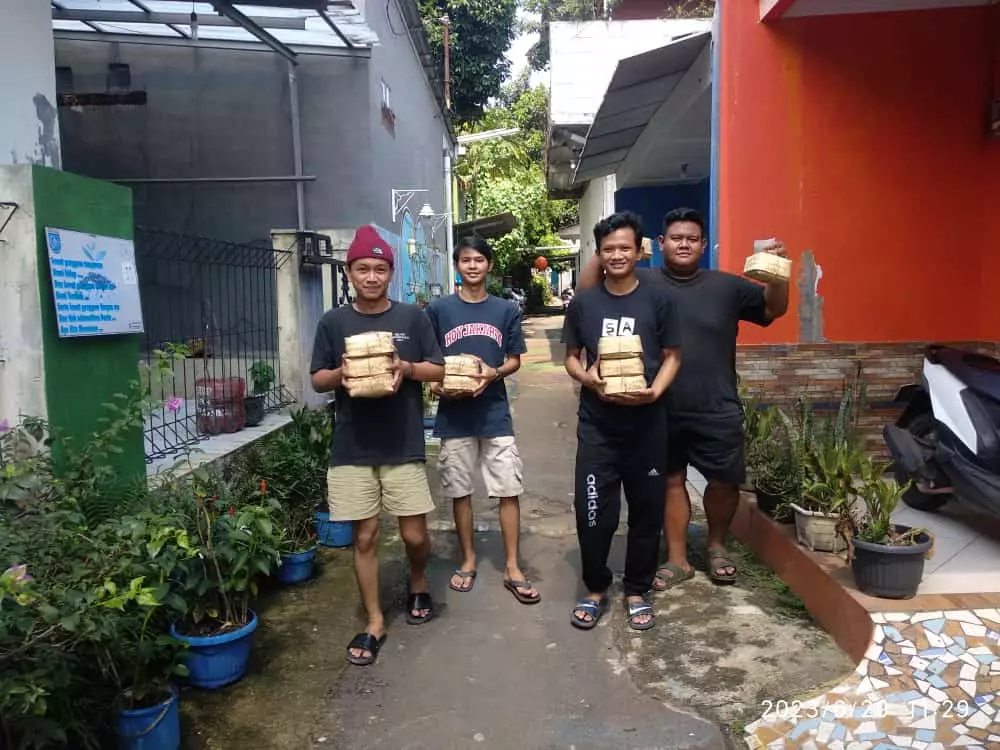 pojokdepok.com- Guna mengurangi sampah saat perayaan Hari Raya Iduladha 1444 Hijriah, warga RW 07 Kampung Rawageni, Kelurahan Ratujaya, Kecamatan Cipayung tidak menggunakan kantong plastik untuk membungkus daging kurban. Sebagai alternatif, panitia kurban menggunakan besek bambu dan daun jati.
